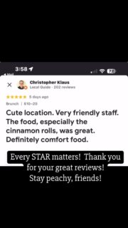 After 30 years of helping others succeed in their businesses, I decided it was time to make a success of my own. With the help of family and a great staff, Just Peachy Cafe was opened in November 2019.